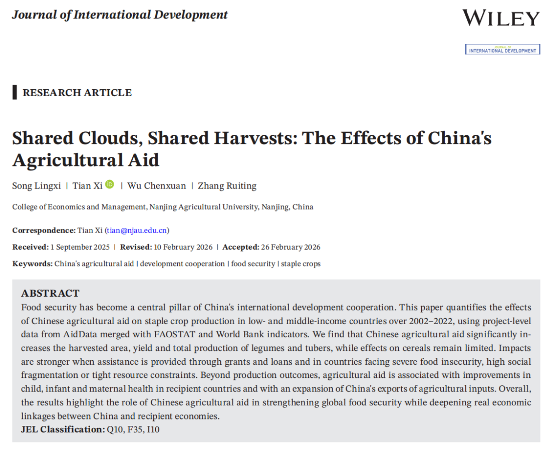 近日,学院田曦教授指导的本科生团队,由宋凌晰、吴晨萱、张瑞婷三位同学合作完成的论文" Shared Clouds, Shared Harvests: The Effects of China's Agricultural Aid "(共同作者,按姓氏首字母排序),在国际发展经济学领域知名期刊《Journal of International Development》在线发表。该研究最初以省级大学生创新训练计划课题立项,三位同学在导师的指导下分工协作、优势互补,历时一年有余,经过系统的数据收集、模型构建与多轮修改,最终打磨出了一篇经同行评审的学术论文。这支本科生团队完整经历了学术研究的全过程,充分彰显了我院本科生参与前沿学术研究的能力与素养。